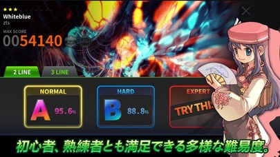 難易度も複数用意されています。初心者向けの2ラインから複雑な指が必要な4ラインまであり、さらにラインの中でもノーマルやハードといった複数の譜面があります。1つの曲でも何度でも遊べるアプリになっています。