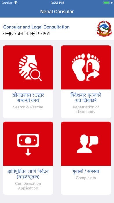 App Storeより引用Effective coordination with the Nepali Missions abroad in providing legal assistance, compensation and insurance amount to the legal heir of the Nepali undertaking various jobs and professions in foreign countries, rescue the stranded Nepali abroad and repatriate dead bodies of the Nepali.