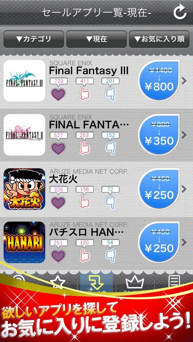 欲しい有料アプリを検索し、お気に入りに登録する事で、