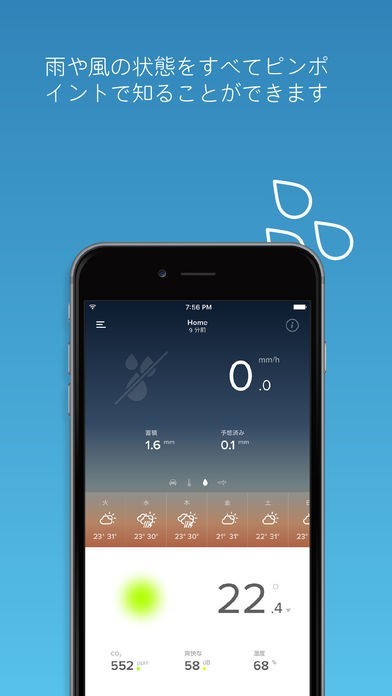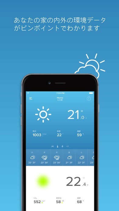 当日の天気だけでなく1週間分の気象情報を調べる事が可能となっています。また周辺地域だけでなく室内の温度も測定出来るのが利点でしょう。CO2の濃度等も多彩に測定していけます。