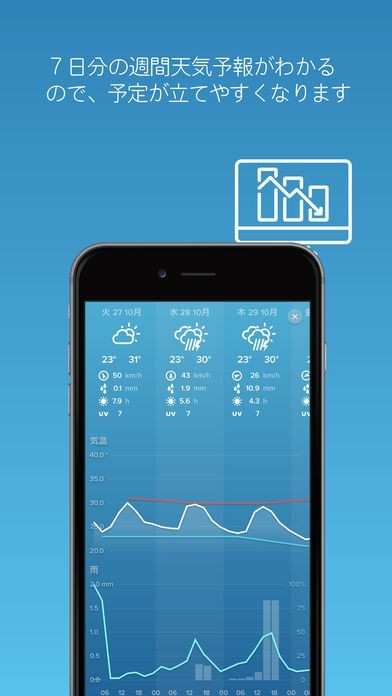 現在地の降水確率や気象の変化を細かく表示することが可能です。温度の変化を折れ線グラフで可視化出来るようにもなっています。外出先から天候に関する情報を受け取れるため、旅行中にも役立つでしょう。