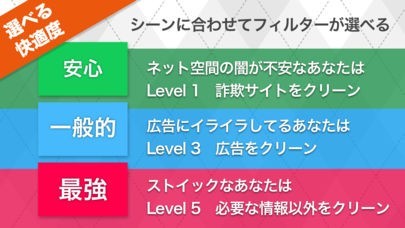 利用者がより利用しやすいよう、セキュリティレベルが3種類用意されています。レベル1は危険な詐欺サイトクリーン、レベル3はレベル1に+広告クリーン、レベル5は必要な情報以外は全てクリーンがあります。