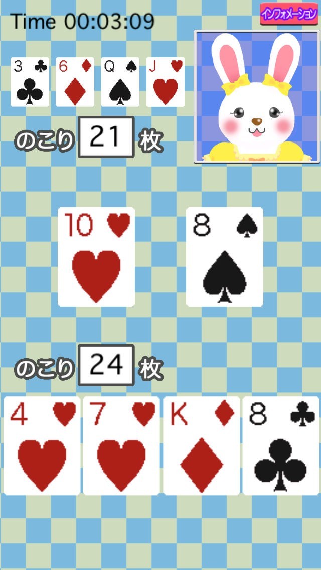相手より先に、自分の持っているカードを、画面中央の台札にすべて置けば勝ちになります。