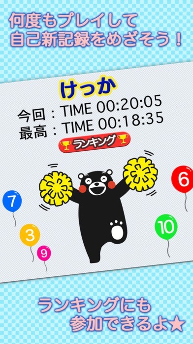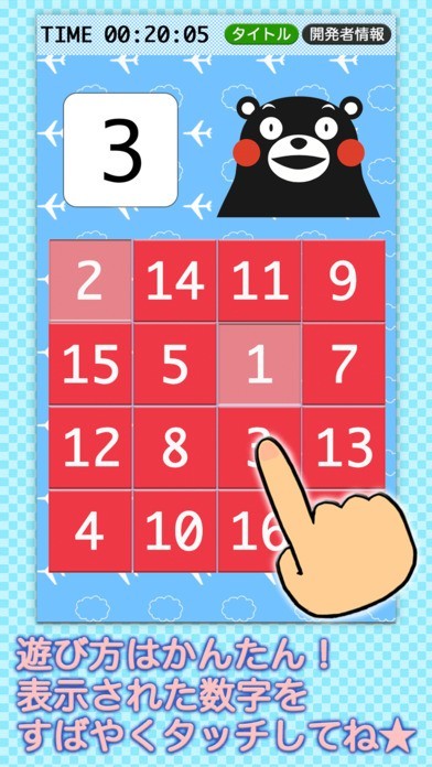 App Storeより引用熊本県の人気キャラクター『くまモン』がタッチナンバー ゲームに登場です! 遊び方は簡単、表示された数字をタッチするだけです。 ぜひ遊んでみてください!