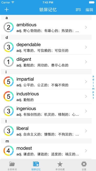 3. 完全自定义单词记忆列表。用户通过“锁屏记忆”和“单词收藏”这两个列表来决定要背哪些单词。