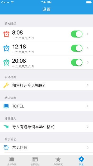 — 如果发现APP没有通知,打开设置 -> 锁屏背单词 -> 通知 -> 允许通知,提醒的单词全部来自锁屏记忆列表,单词提醒时间可以在设置中选择