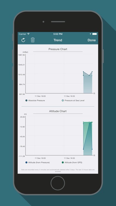 現在の気圧や高度だけではなく、時間による変化をチャート形式で見られます。また気圧データの写真を撮ることも可能です。操作も簡単なので誰にでも使いやすいアプリです。
