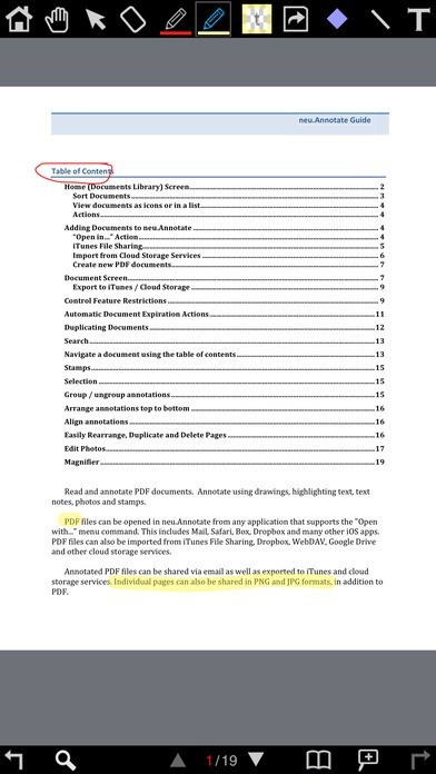 Annotated PDF files can be shared via email as well as exported to iTunes and Dropbox. Individual pages can also be shared in PNG and JPG formats, in addition to PDF.
