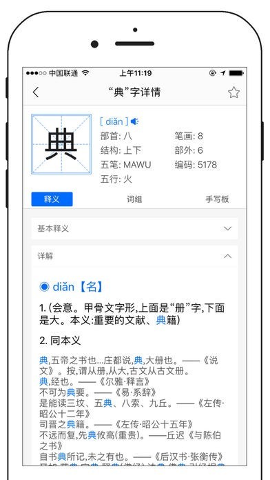4、汉字释义/例句/词语/手写板/拼音/五笔/部首/笔画;