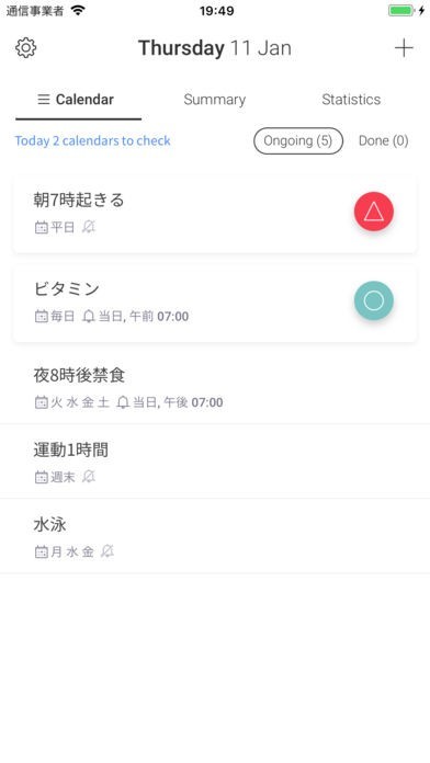 目標を達成した日には、カレンダーにマルをつけて「Check!」できるこのアプリは、自身の設定した目標への進捗状況がひと目で管理でき、毎日の継続を促すモチベーションともなるアプリです。