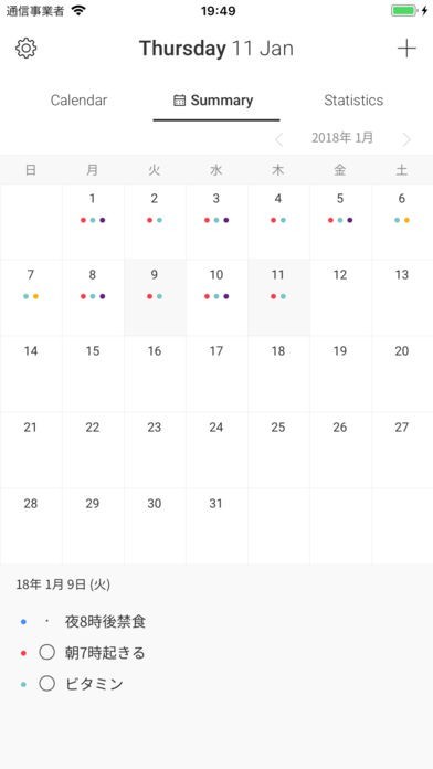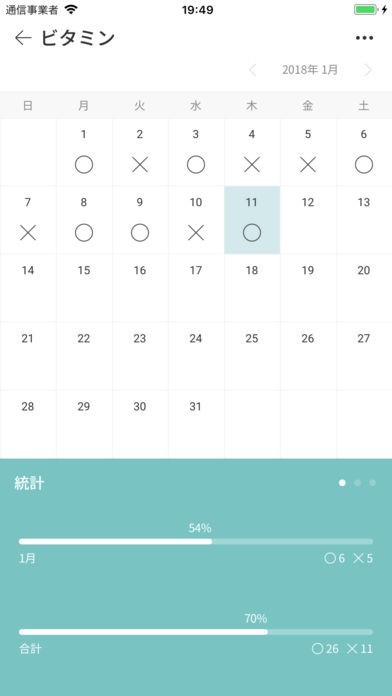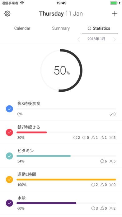 統計機能は、このアプリの特徴の1つです。月別に進捗状況の確認ができる他、これまでの全体の統計も表示が可能で、積み上がる実績が自身のモチベーションへと繋がります。