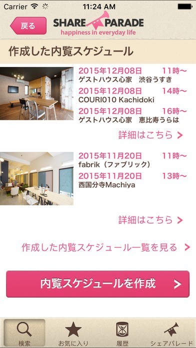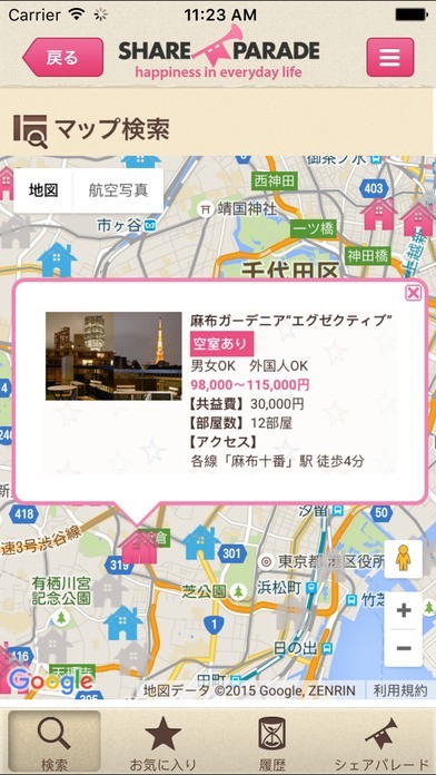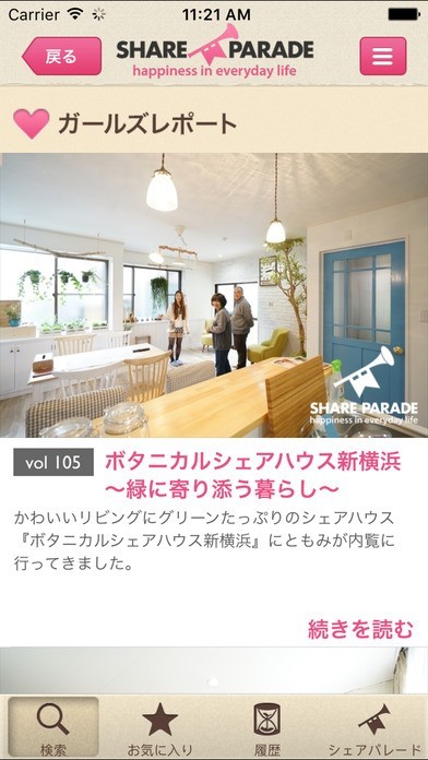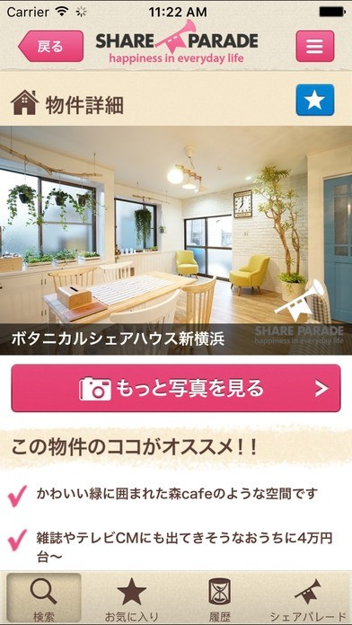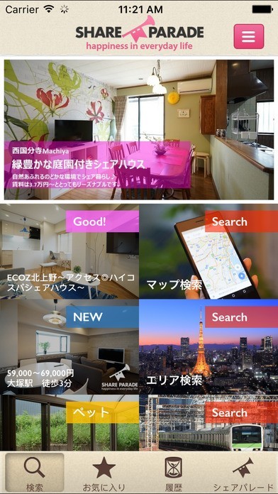 SHARE PARADEは、シェアハウスの検索に特化したアプリです。「一人暮らしに飽きちゃった」という人に最適となっています。本アプリに掲載されている物件の写真は、どれもカラフルでとても綺麗です。おしゃれな物件ばかりがラインナップされているので「ここに住んでみたい!」という意欲を強くさせてくれます。特に、女の子に嬉しいのは、ガールズレポーターによる詳細なデビューがあることです。女の子目線で物件の良し悪しをレビューしてくれてます!物件を検索する際は、エリア検索、マップ検索、ターミナル検索の3つからOKです。それにプラスして、こだわり条件を付け加えれば、きっと好みの物件が出てきます。