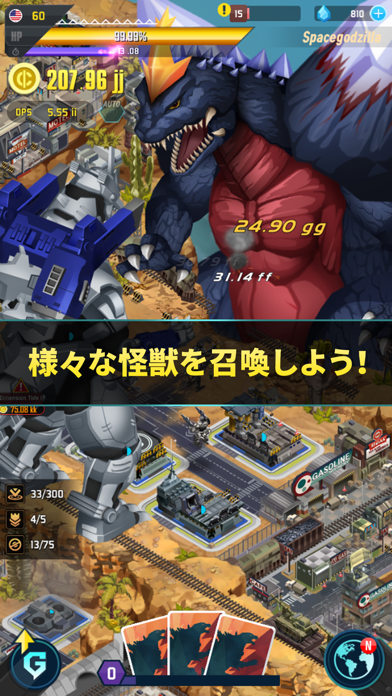 - 巨大な怪獣の攻撃する合間に画面をタップして防衛施設の生産性を向上したり、編成した怪獣カードを召喚。