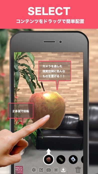 『MagicMovieCamera』はカメラを使用し、画面に映しだされた現実空間に様々なコンテンツ(3Dデータ)を配置して動画を撮影できる、AR(拡張現実)を利用したアプリです。