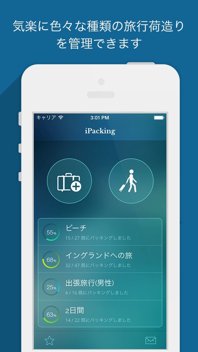 iPackingは素晴らしく、楽しいの荷物作りアプリです、あなたの荷物作り及びあなたの如何なる旅行タイプの処理を協力することが出来ます。あなたの出張やバカンス、キャンプ或いは車での長距離旅行等々は全部対応できます、このアプリを使えば、あなたも荷物作りを好きになります。