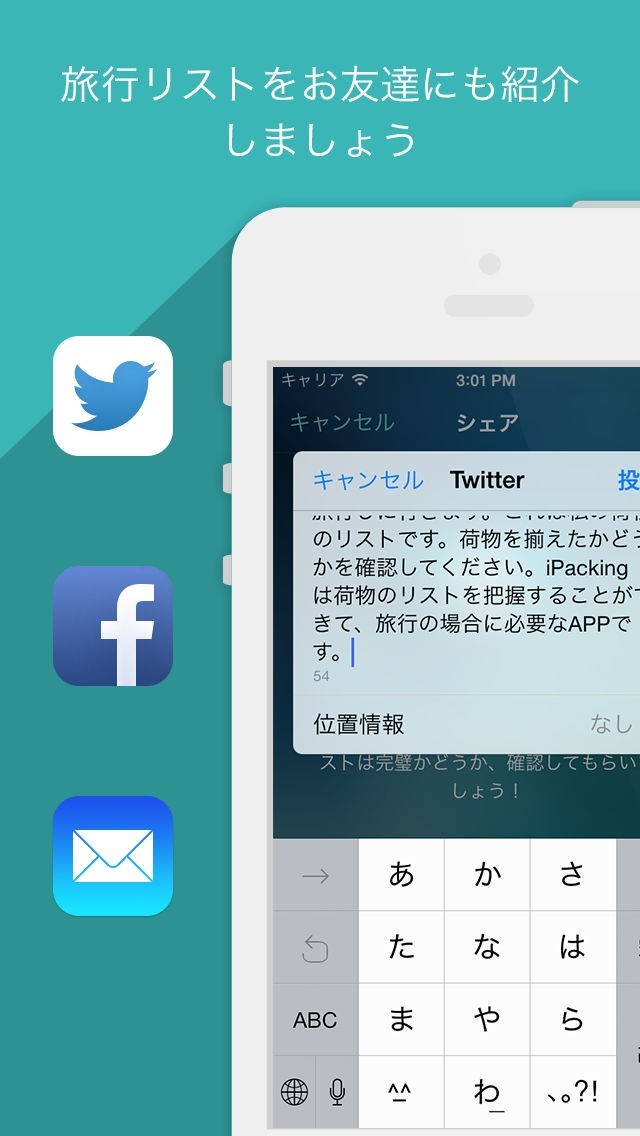 .Facebook、twitter或いはemailを使えば、あなたは友達とパッキングリストを共有することができます。