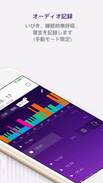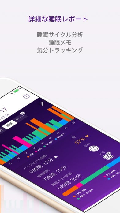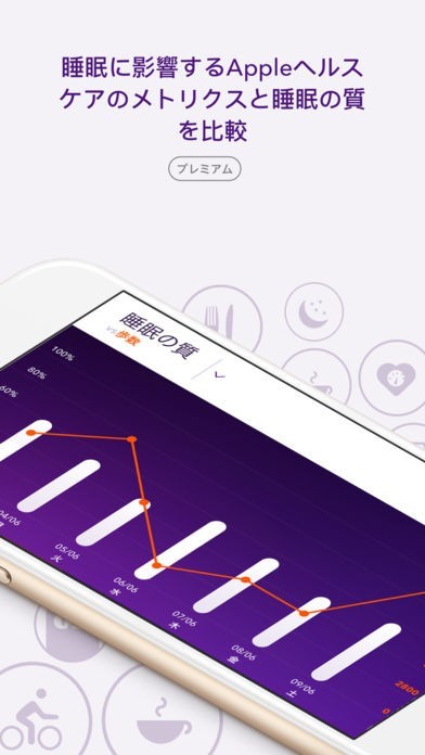 Apple Watchをつけたまま、もしくは枕側に置いておくだけで睡眠サイクルを分析してくれます。睡眠を促すサウンドを鳴らす機能もあるので、気持ちよく入眠することができます。