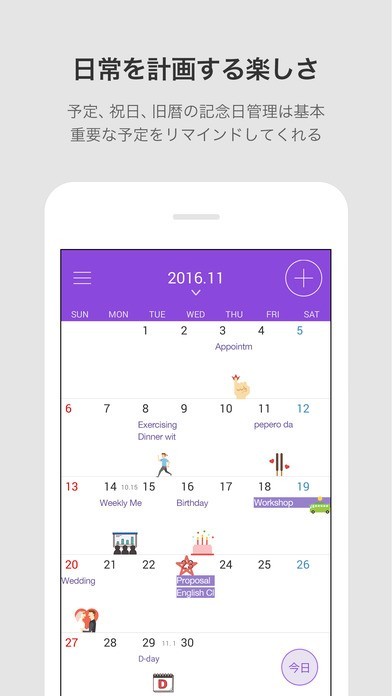 予定と記念日に好きな色を指定して分類し、様々なスタンプで強調することもできます。