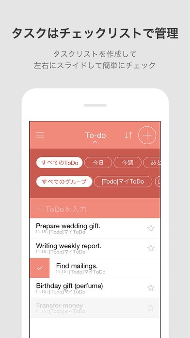右にフリックして完了、左にフリックして削除しましょう。ToDoグループも簡単に作成できます。
