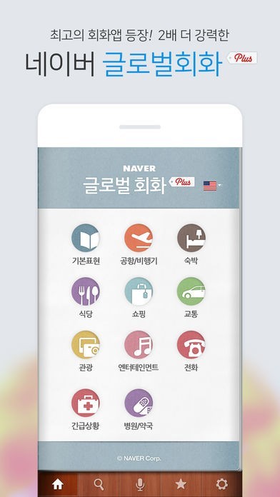 생생한 여행회화 표현으로 해외 여행의 필수앱으로 자리매김한 “네이버 글로벌회화”! 이번에는 일상생활 내 표현까지 포함하여 한층 더 강력한 “네이버 글로벌회화 Plus”를 새롭게 선보입니다.
