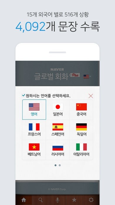 NAVER Global Phrase Book, with 4,092 essential phrases in 15 different languages, is a must-have application for all: in addition to travelers, for those who are learning foreign languages, expats living overseas, as well as those who frequently communicate with foreigners.