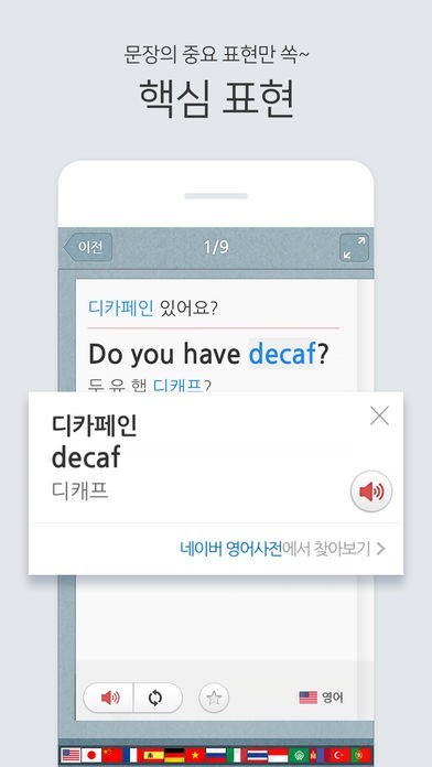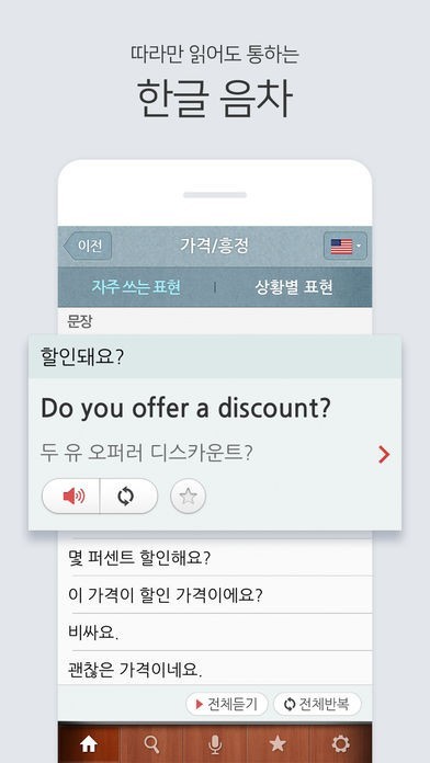 In addition to the original language, all phrases are spelled in Korean, helping you easily pronounce sentences even if you don't know the language. You can hear the pronunciation of native speakers by tapping the speaker icon. Make sure you get the right intonation and accent!