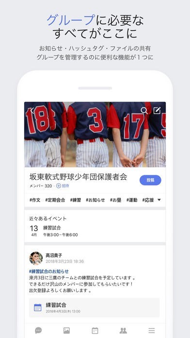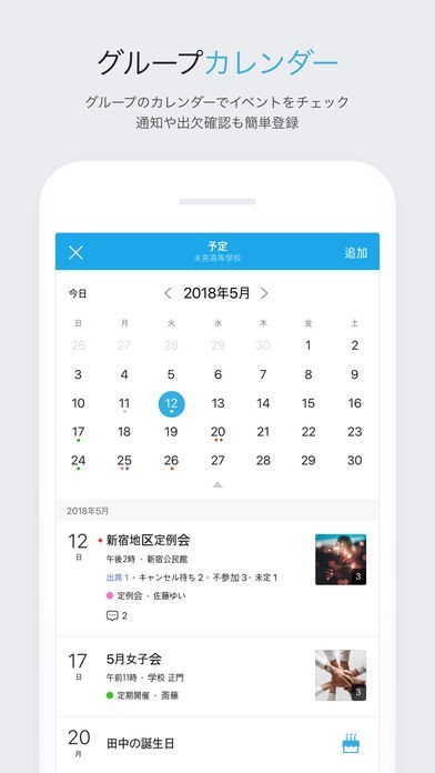グループ管理に必要な機能を備えたアプリです。グループ内トークや日程や出欠確認などが簡単にできて便利です。大人数で複雑化しやすいサークルや部活の運営を快適にサポートしてくれます。