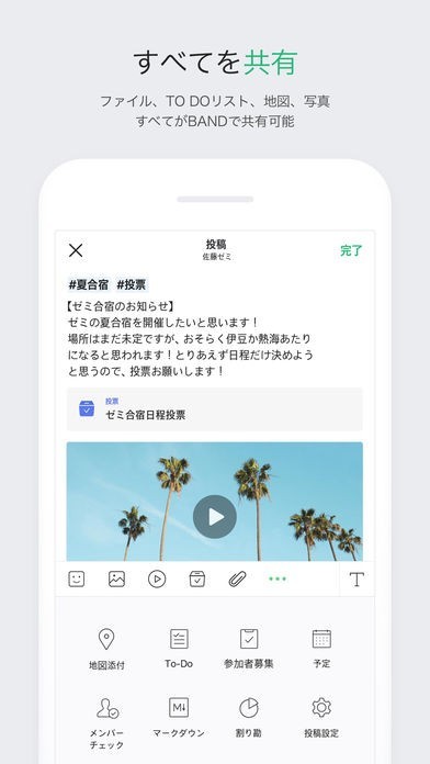BANDは、特定の目的を持ったプライベートなグループ内での円滑で自由なコミュニケーションをサポートするアプリです。仕事、趣味、学校など様々な場所で発生するプロジェクトやサークル、その他の活動のためのグループにおいて、テキスト・ボイス・画像・スケジュール・ファイルといった豊富な手段で情報交換、情報共有を可能にします。チャットのようなリアルタイムコミュニケーションにも、カレンダーによる予定や連絡事項の共有にも使え、外部には公開したくない大事な情報を、グループに登録した人達だけの間でやりとりできます。