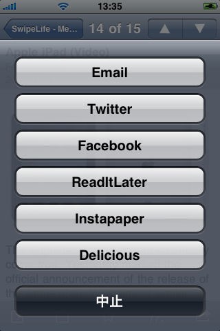 Facebook、Delicious、ReadItLater、Twitterなどのソーシャルサービスやメールを使って情報をシェアすることができるようになっています。