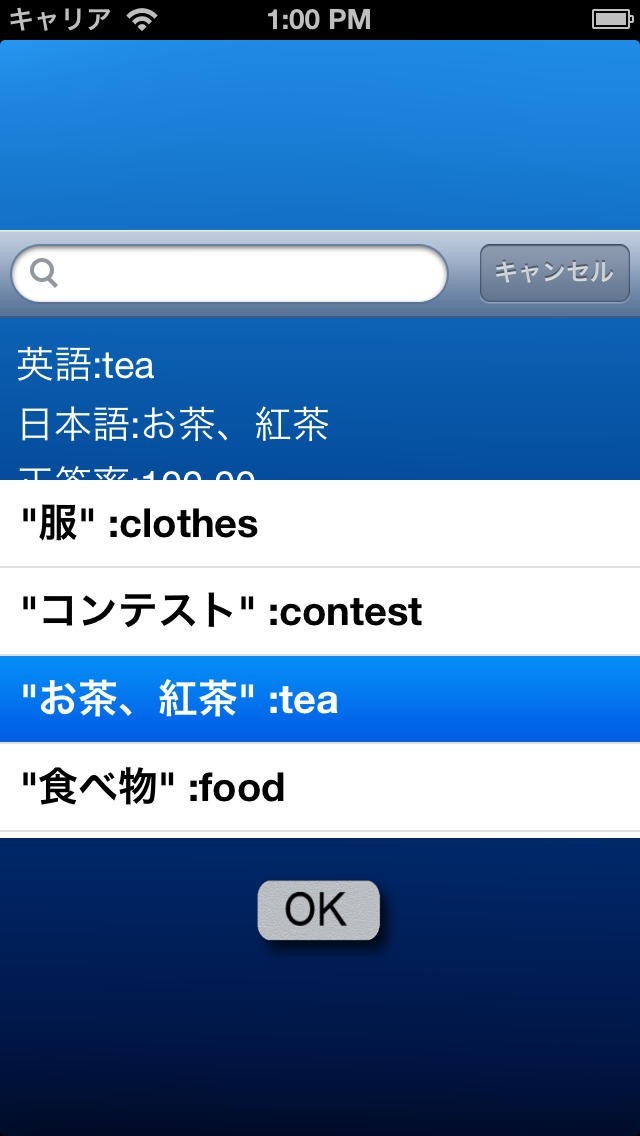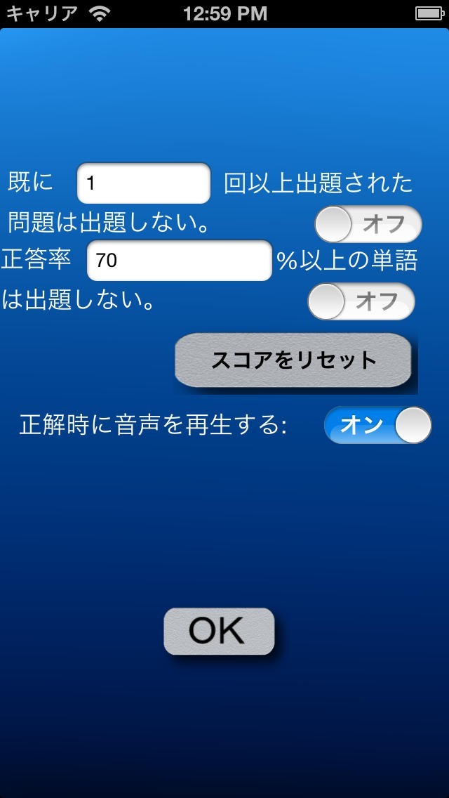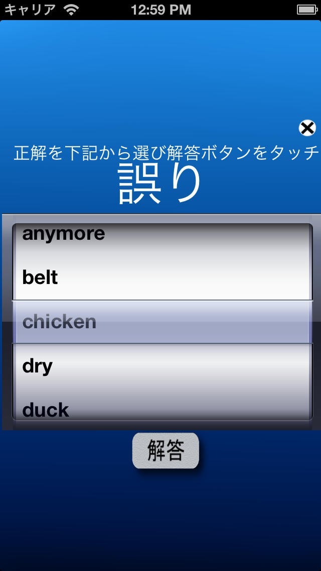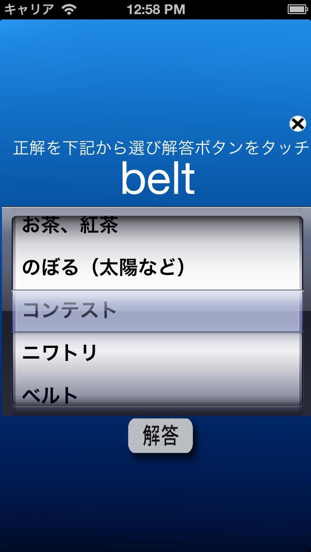 App Storeより引用英単語を楽しく勉強するために最適なアプリです。このアプリでは、問題形式として、英語から日本語、日本語から英語、の両方向をサポートしており、出題されている単語の和訳(または英訳)を20個の選択肢の中から選ぶことで解答します。Lite版では中学2年時に習う単語を120語を収録してあります。 正答率、および解答回数はアプリ内のデータベースに蓄積されて行き、それぞれの単語についての正答率が個別に計算されるので、自分の苦手とする単語を一目で見つけ出せます。また、達成率、および平均正答率が自動的に計算され、トップページに表示されるので、自分がどのくらいの単語を覚えたか簡単に把握できます。達成率が100%に達したときが、収録された全ての単語を自分のものにしたときです。 設定機能を用いれば、出題される問題を正答率の12%以下、出題回数8回以下というように、自由に制限できます。この機能を使うことで、自分の苦手とする問題を重点的 に勉強することが出来ます。 さらにこのアプリでは、単語の検索機能を備えており、キーワードを検索フィールドに入れることで簡単に検索できます。また、正答率や出題回数でも検索できるので、自分の苦手な単語を検索することも容易です。
