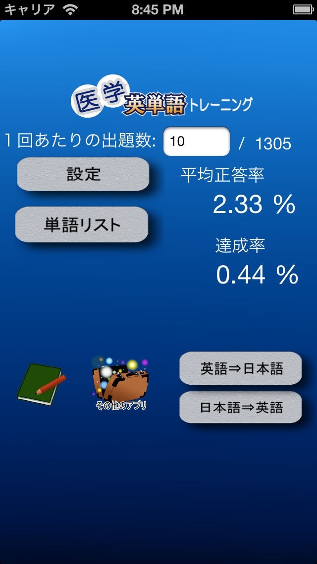 App Storeより引用英単語を楽しく勉強するために最適なアプリです。このアプリでは、問題形式として、英語から日本語、日本語から英語、の両方向をサポートしており、出題されている単語の和訳(または英訳)を20個の選択肢の中から選ぶことで解答します。単語数は1300語以上を収録しており、医学を学ぶにあたり必要な単語を選定してあります。