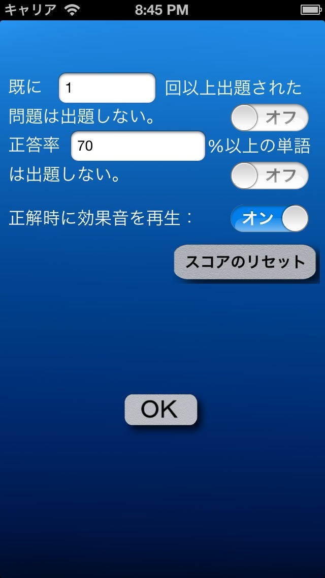 設定機能を用いれば、出題される問題を正答率の12%以下、出題回数8回以下というように、自由に制限できます。この機能を使うことで、自分の苦手とする問題を重点的に勉強することが出来ます。