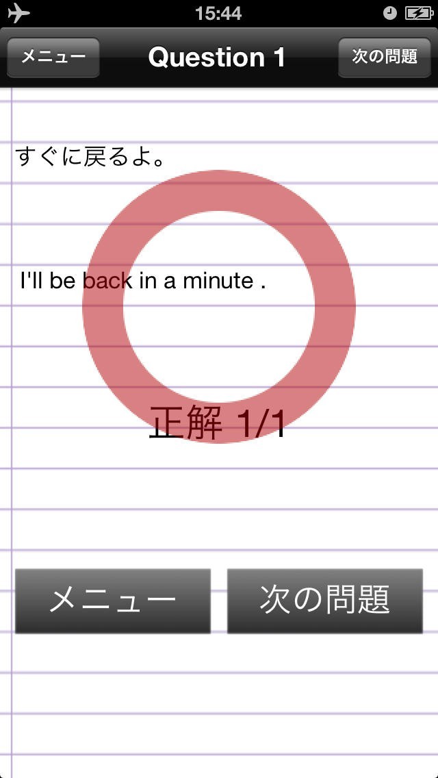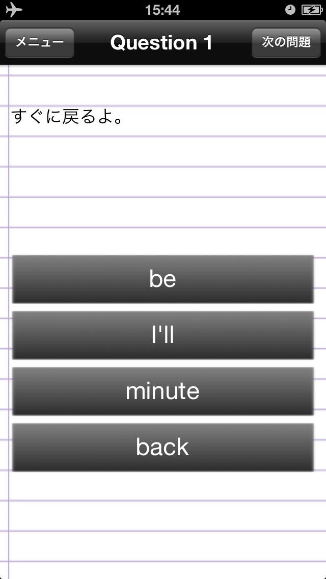 日本語の文章に合わせて英単語をならべて正しい英文を作っていく英語勉強アプリです。最初からすべての単語が並んでいるわけではなく、四択の単語の中から選んで正解すると新しい単語が四択の中に追加されるので、常に四択問題をやっている感じになります。 英文の単なる穴埋めではなく、限られた選択肢に中から単語を順番通りに並べなくてはいけないのでより難易度が上がっています。問題は300問用意されているのでやりごたえがありますが、1問にかかる時間は短いのでちょっとした空き時間でも勉強できます。