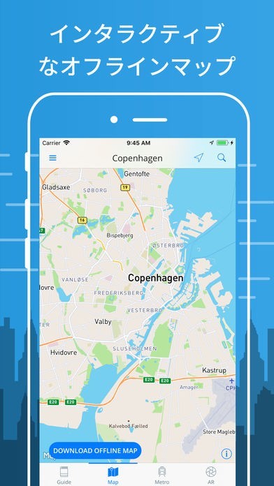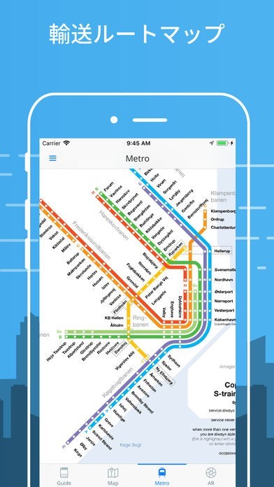 コペンハーゲンの地図が収録されており、通常のマップに加えて鉄道の輸送ルートも閲覧することができます。目的地までの行き方も表示されるので、初めての地でも安心です。