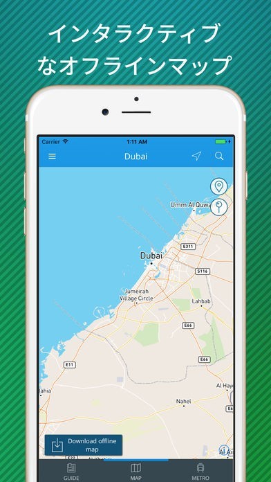 ドバイ オフラインマップと旅行ガイドはオフライン環境でも使えるダウンロード方式となっており、GPS機能も地図には搭載されています。通信環境が不安定な場所でも安心して使える点が利点です。