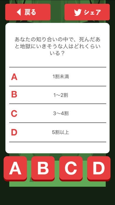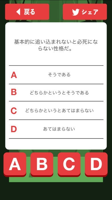 質問の下に4つの選択肢が表示されます。左側にアルファベッドが表示され、対応するボタンが画面下部にあります。自分の考えに一番近いものをタップしてください。質問にすべて答えると結果が画面に表示されます。