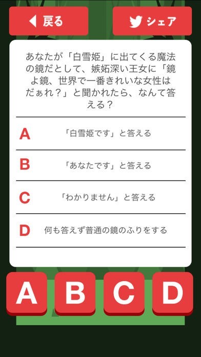 指定された質問に答えると、自分に合った童話の登場人物がわかるゲームです。すべて4つの選択肢から選ぶ形式なので、誰でも簡単に操作できます。ちょっとした暇つぶしにオススメのゲームです。