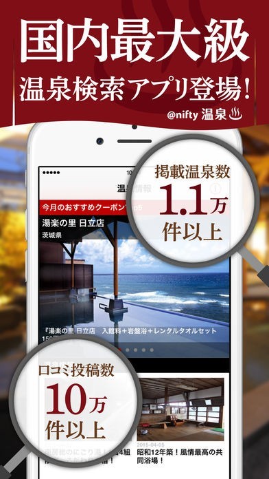 国内の温泉の中でも、クーポンのある温泉を簡単に検索できる温泉検索アプリです。掲載されている温泉は1.1万件以上。口コミは10万件も掲載されているので、行ってみたい温泉を簡単に見つけることができます。温泉は、有名な温泉だけでなく、日帰り温泉やスーパー銭湯、健康ランドや温泉旅館など様々な種類が掲載されています。キーワードで温泉を検索したり、現在地から近い温泉を探す機能も付いているので、知らない土地でもクーポンがある温泉を簡単に見つけることができます。温泉好きにはピッタリのアプリです。