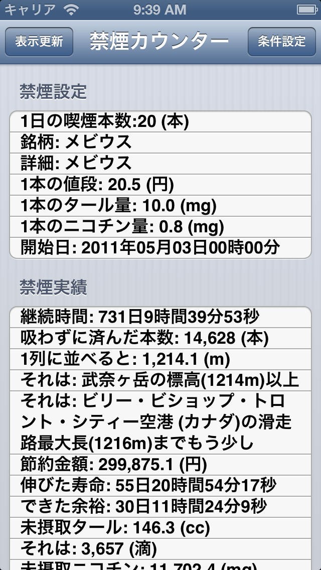 吸っているタバコの銘柄を登録することにより、摂取せずにすんだタールやニコチンの量が分かる禁煙補助アプリです。 使用方法は簡単で、吸っているタバコの銘柄と吸っている本数、禁煙開始日を登録します。禁煙開始日は時刻入力にも対応しており、細かい時間まで計算可能です。後は禁煙した日数に応じて摂取せずにすんだタールやニコチンの量、節約できた金額などが増えていき、その達成感から禁煙を継続しやすくなります。他にも禁煙したことでのびた寿命や、出来た時間なども表示されるようになっており、タバコをやめたことのメリットが実感できるアプリとなっています。本気で禁煙したい人は使ってみてはいかがでしょうか。