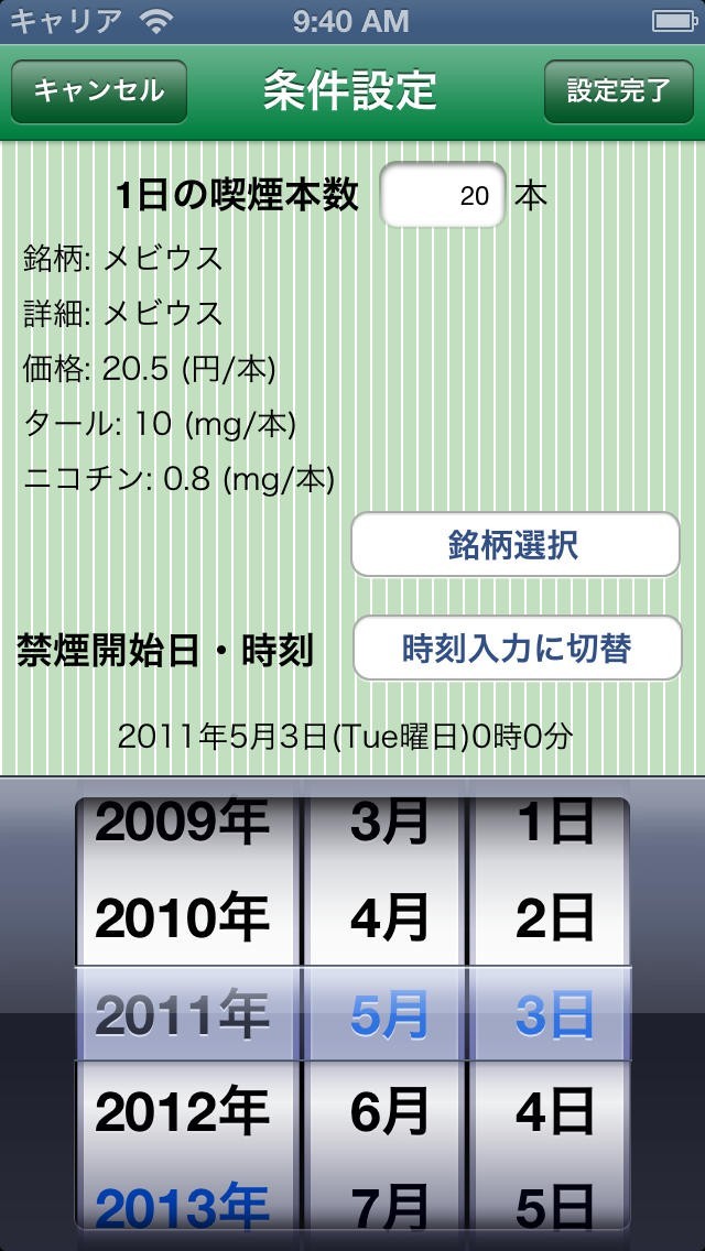 条件指定では自分が吸っていた種類や喫煙量を登録・変更できます