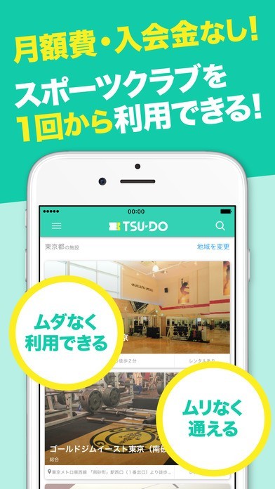 スポーツクラブの多くは月額会員制(10,000円前後)での利用が中心ですが、チケット・クーポンアプリ「TSU-DO」を利用することで、スポーツクラブが1回ごとに都度利用(1回2,000円前後、499円から)することができます。