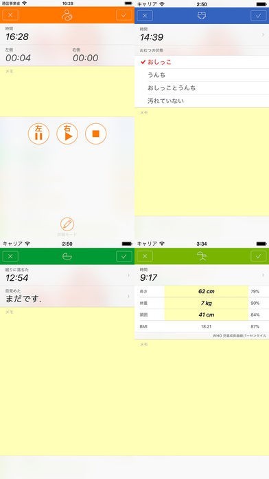 赤ちゃんのお世話を項目ごとに記録追跡できるので、何時にやったか思い出せて便利です。