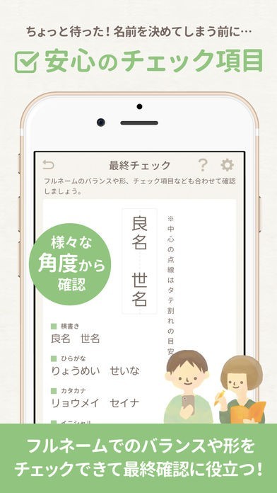 姓名判断を元に、画数などを調べて良運となる名前を考えてくれます。画数などはとても参考になるし、可愛い画面で暖かい気持ちになれます