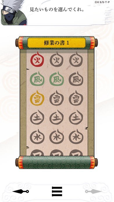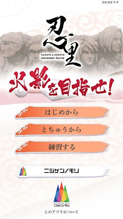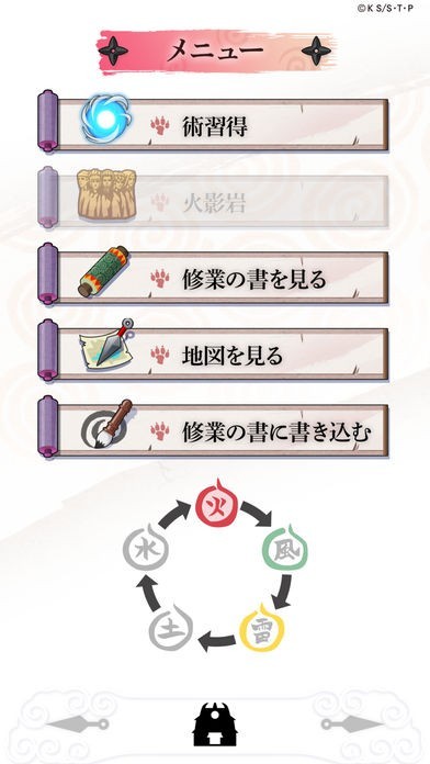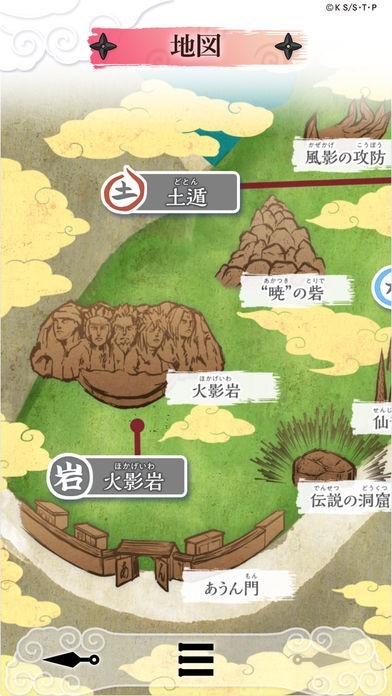 App Storeより引用ニジゲンノモリで「火」、「風」、「雷」、「土」、「水」の5つの術を習得して、火影を目指そう!