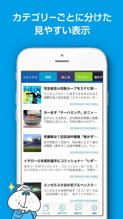 スポーツ新聞ではお馴染みとなっているスポーツニュースや芸能ニュースの他、競馬記者の予想やプロゴルファーのゴルフレッスンの配信など様々なジャンルを取り扱っています。 イラストや画像、アイコンにスマートフォンをかざすと動画が見れるようになります。 カテゴリーごとに記事が分けられており、見たいカテゴリーから見たい記事を探すことが可能です。