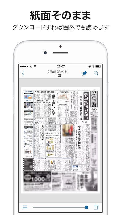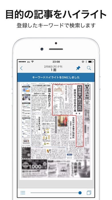 日本経済新聞が配信する公式アプリ「日本経済新聞 紙面ビューアー」では、紙面をそのままスマートフォンで閲覧することができます。片手でも操作可能となっており、通勤電車の中や、ちょっとした待ち時間の暇つぶしとしても最適。気になるキーワードはハイライト表示を行い、目当ての記事にすぐに辿りつけるなど、便利な機能も満載です。