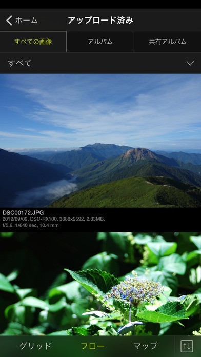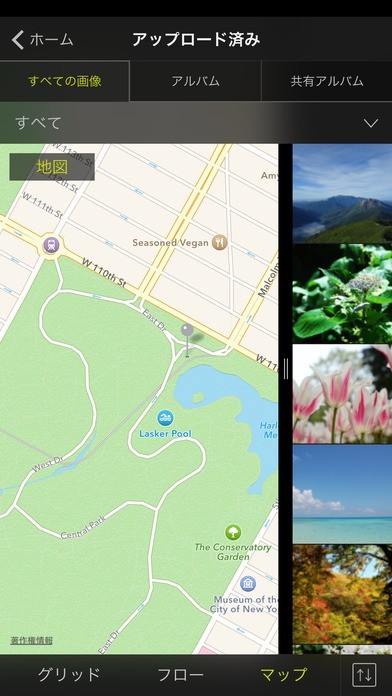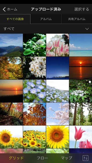 グリッド、フロー、マップという3つの写真閲覧方法が用意されている