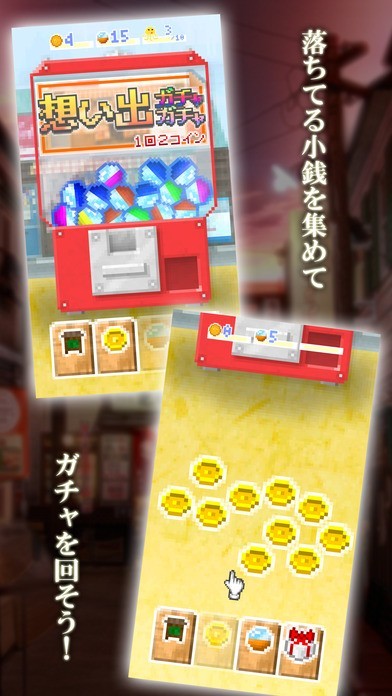 アプリ「想い出ガチャガチャ 昭和あるある 〜 無限にガチャまわし放題」では、ゲーム内の街に落ちているコインを拾い集め、そのコインで昔懐かしいアイテムがいっぱい詰まった駄菓子屋さんのガチャガチャをどんどん回すことができます。ただガチャガチャのアイテムをコレクションするだけではなく、機械の置いてある駄菓子屋さんにまつわる、秘められたストーリーもだんだんと明らかになっていくので、すぐ飽きることもなく、ドキドキしながら遊べるようになっています。