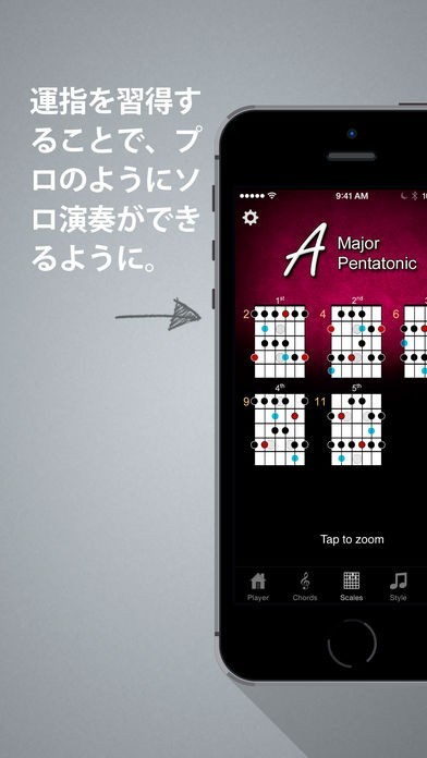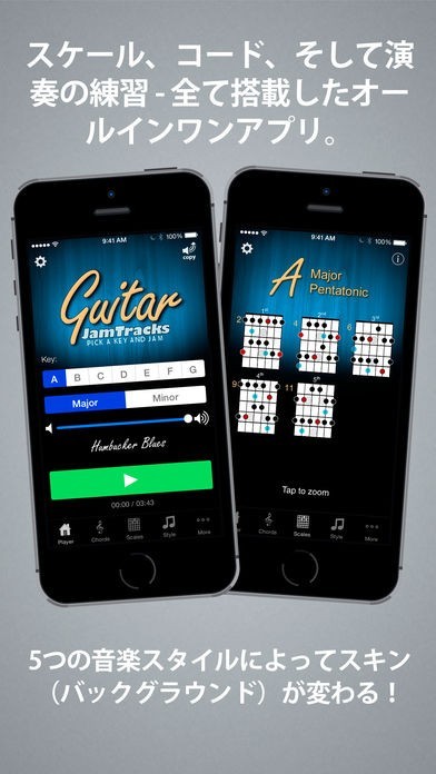 ジャズ、ブルース、カントリー、レゲエ、ロックのバッキングトラックが用意されているので、ペンタトニックスケールを習得すれば、スケール練習、ソロ演奏の練習が可能になります。