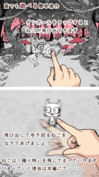 一風変わった世界観を持つ猫ゲームをお探しの方に注目してもらいたいのが「ねことダンボール」です。 このアプリは、絵本の中のようなメルヘンチックな世界で、森の奥深くに迷い込んだ幼い兄妹が、キモかわいい猫達と遭遇するストーリーです。 操作方法は、至って簡単です。 森の中で見つけたダンボールをタップすると猫が元気よく飛び出してくるので、なでてあげるとポイントをゲットできます。 このねこポイントを貯めると魔法を使えるようになります。 基本的に「猫と遊んで」「放置して」を繰り返すと猫が増えていくのでスキマ時間に楽しめます。